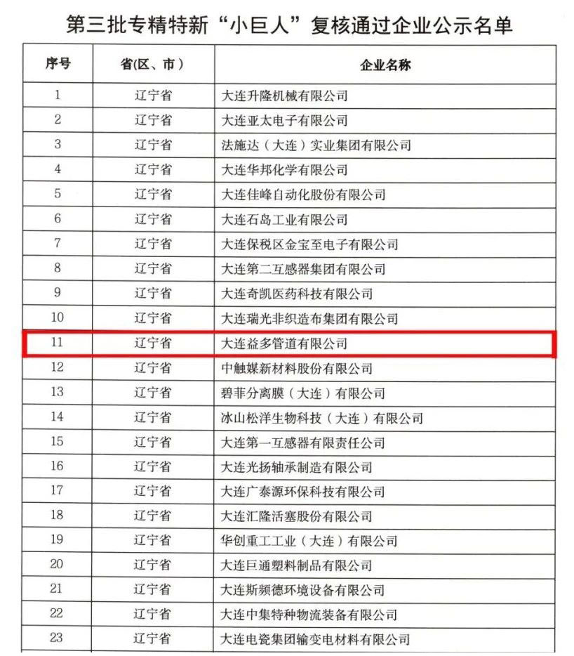 近日,工业和信息化部发布《第六批专精特新“小巨人”企业和第三批专精特新“小巨人”复核通过企业名单》,大连羞羞视频软件在线下载管道有限公司通过第三批专精特新“小巨人”复核,再度荣登榜单,连续获此殊荣!